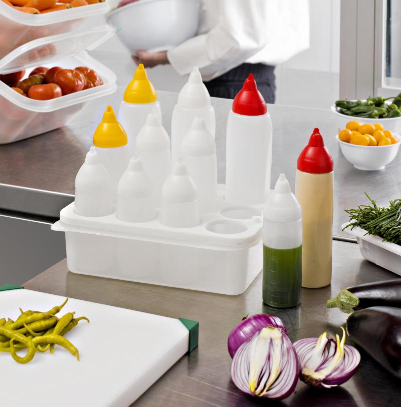 Os Doseadores Anti-Gotas são fabricados em polietileno resistindo a manchas e odores. Além disso, permitem decorar um prato de forma limpa, temperar uma salada ou qualquer outro preparo com a quantidade certa e rigorosa.