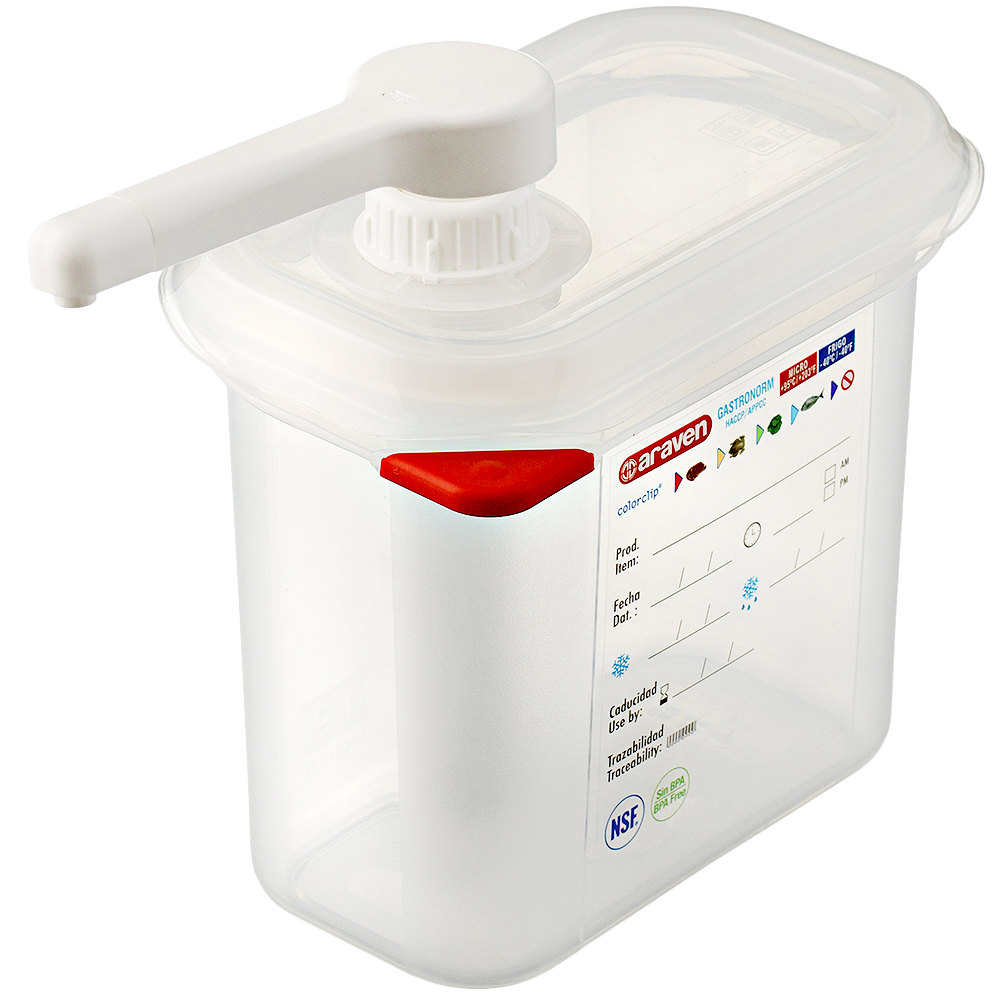 Estes Dispensadores de Molhos possuem uma etiqueta que permite escrever informações importantes sobre o produto, que são essenciais para cumprir com as diretrizes de segurança alimentar. O rótulo inclui espaço para registar o tipo de alimento, a data e a hora, o uso por data e a identificação do dia da semana.