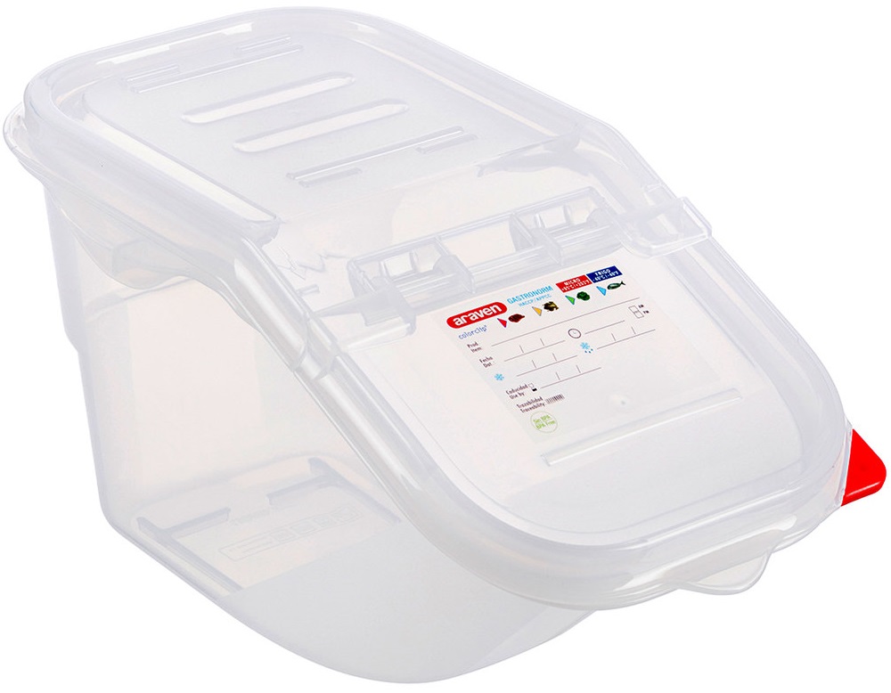 Os Contentores Herméticos possuem uma etiqueta que permite escrever informações importantes sobre o produto, que são essenciais para cumprir com as diretrizes de segurança alimentar. O rótulo inclui espaço para registar o tipo de alimento, a data e a hora, o uso por data e a identificação do dia da semana.
