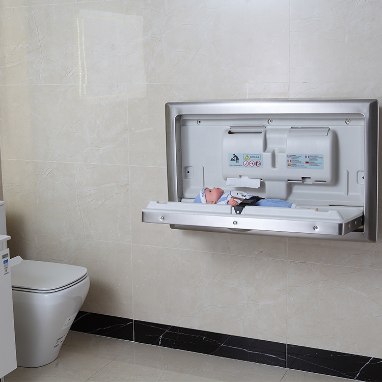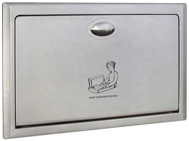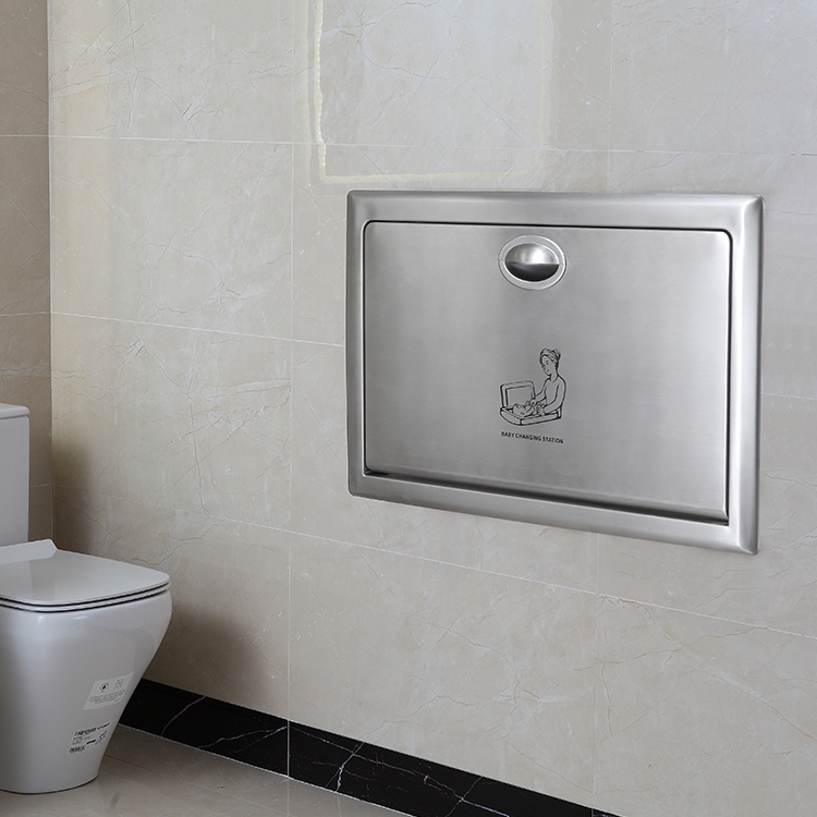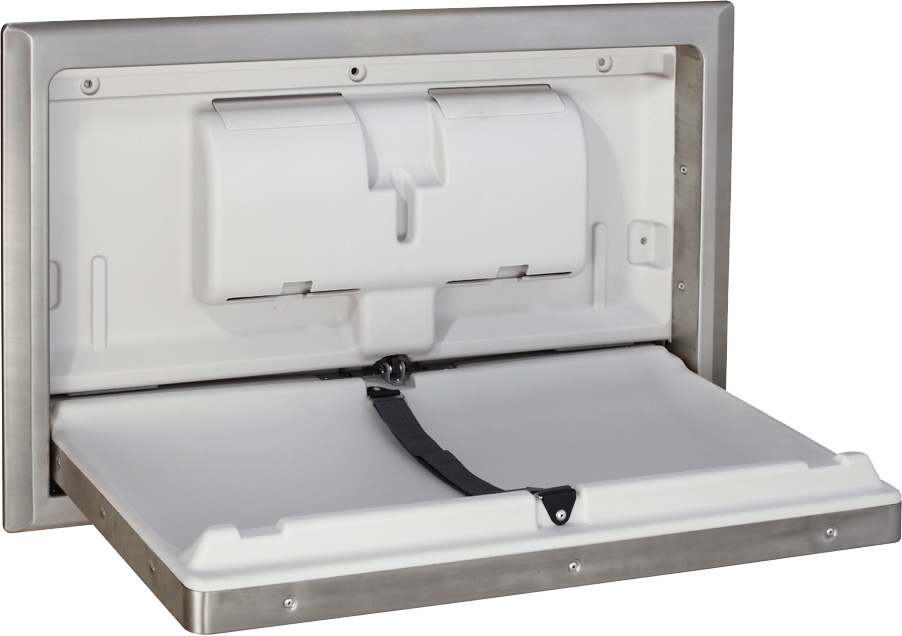 O Fraldário Horizontal fica embutido na parede e é feito em aço inoxidável, fornecendo aos pais uma superfície segura e conveniente para cuidar do bebé.