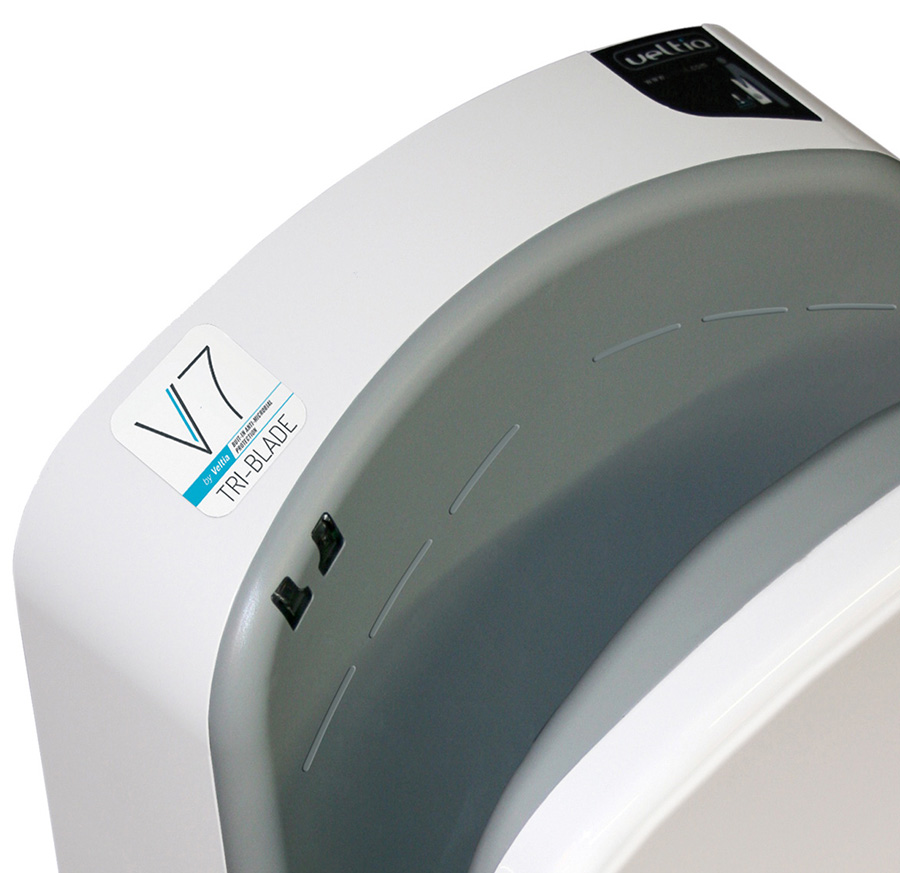 O Secador de Mãos V7 Tri-Blade da Veltia tem um design compacto e uma alta resistência para o uso contínuo em edifícios com altas frequências de uso, como Hotéis, Aeroportos, Centros Comerciais, entre outros.